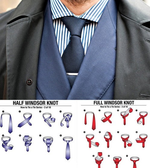 16.不要嘗試溫莎結之外的領帶系法,根據自己的臉型來決定用半溫莎結還是全溫莎結(溫莎結怎么扣,下面有小圖,自己保存吧~)。如果你不知道自己的臉是大還是小,問問男性朋友們,他們的評價會更客觀。