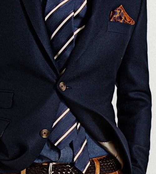 3.除了領帶,抖騷的還有方巾。胸前口袋里塞一條方巾可以讓你看上去更優雅,但要記住,方巾的材質和圖案千萬不能與領帶一樣。在你退化成一個老古董之前,記住方巾是穿西裝時自由度最高、最能顯示個性的地方。