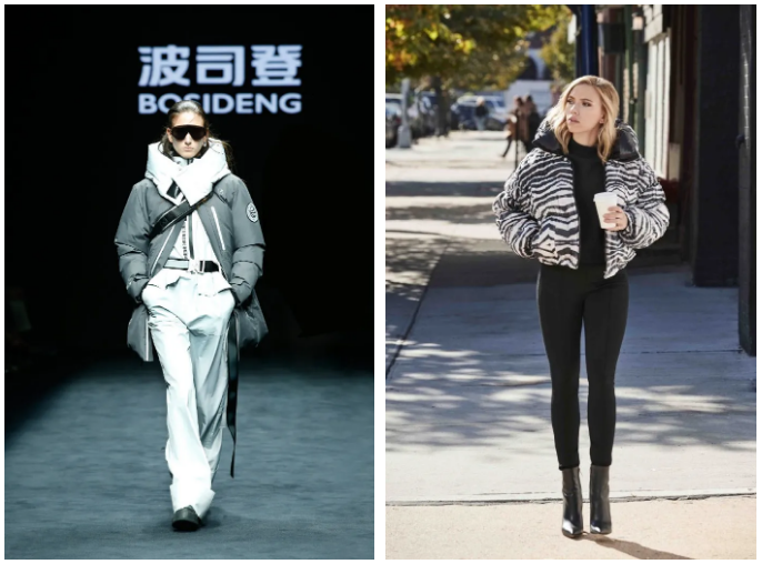 右:Scarlett Johansson 身著波司登 × Jean Paul Gaultier 聯名系列