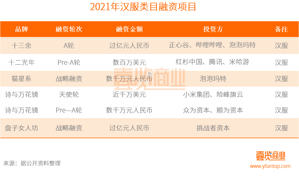 其中,中國風文化藝術攝影品牌“盤子女人坊”在戰略融資中,獲得挑戰者資本的億元融資;漢服古裝品牌十三余在A輪融資中獲得過億元融資,投資方為正心谷資本、嗶哩嗶哩和泡泡瑪特。