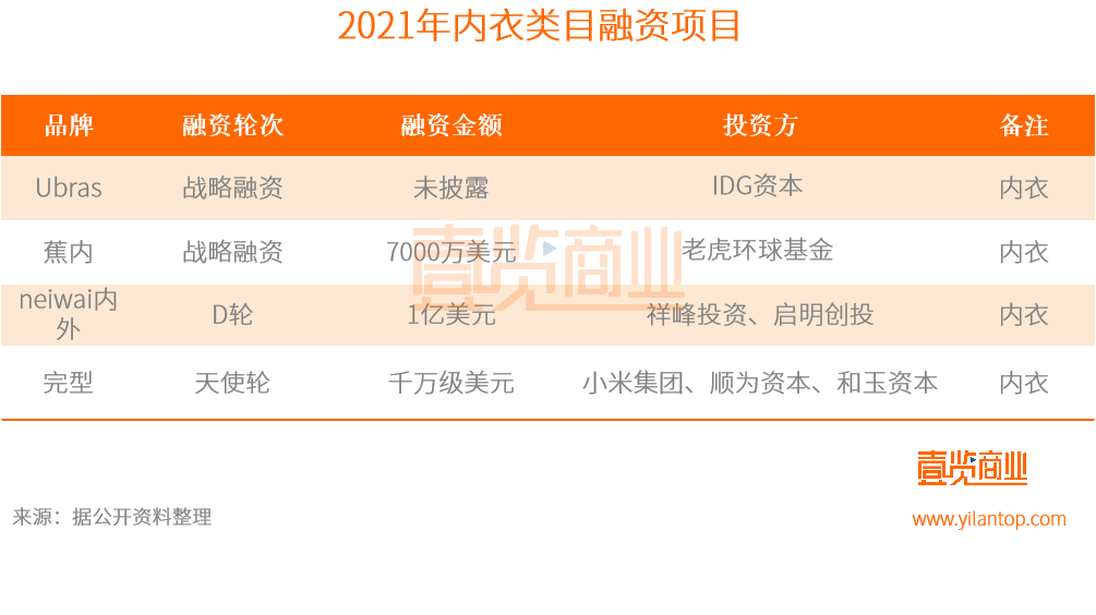 據壹覽商業統計,2021年內衣類目中有Ubras、蕉內、neiwai內外、完型4個品牌獲得融資,融資金額為11.53億元。除Ubras未披露融資金額外,其余品牌融資金額均為億元級別。其中,僅neiwai內外一個品牌的融資金額就高達6.4億元。