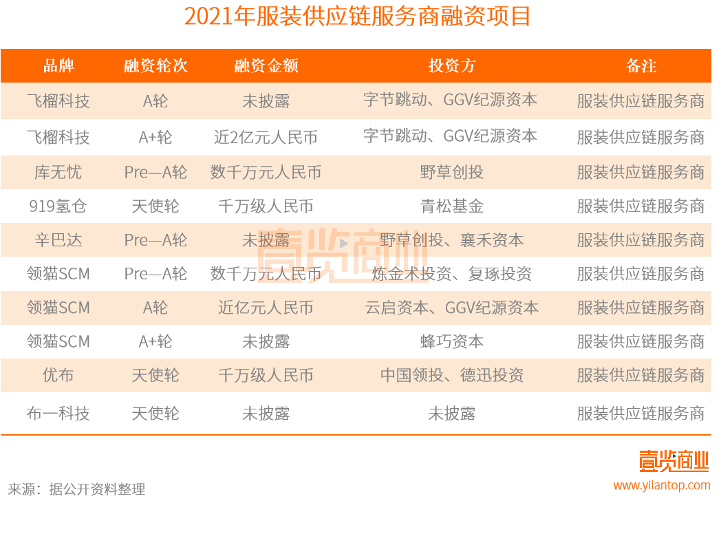 據壹覽商業不完全統計,2021年中包含飛榴科技、庫無憂、領貓SCM、布一科技等7個服裝供應鏈服務商獲得融資,披露融資金額為3.8億元。其中,領貓SCM品牌在一年內連獲三輪融資。