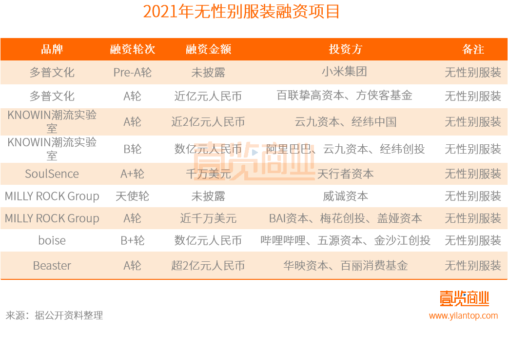 與此同時,2021年也有多個無性別服飾品牌獲得融資。據壹覽商業統計,2021年初以來,多普文化、KNOWIN潮流實驗室、bosie、beaster等6個無性別服裝品牌獲得了融資,融資金額超12億元。
